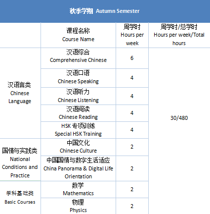 Autumn semester (one year) : September intake with zero-based Chinese language